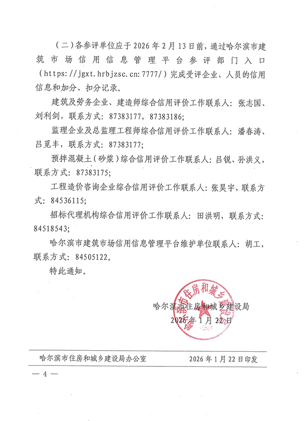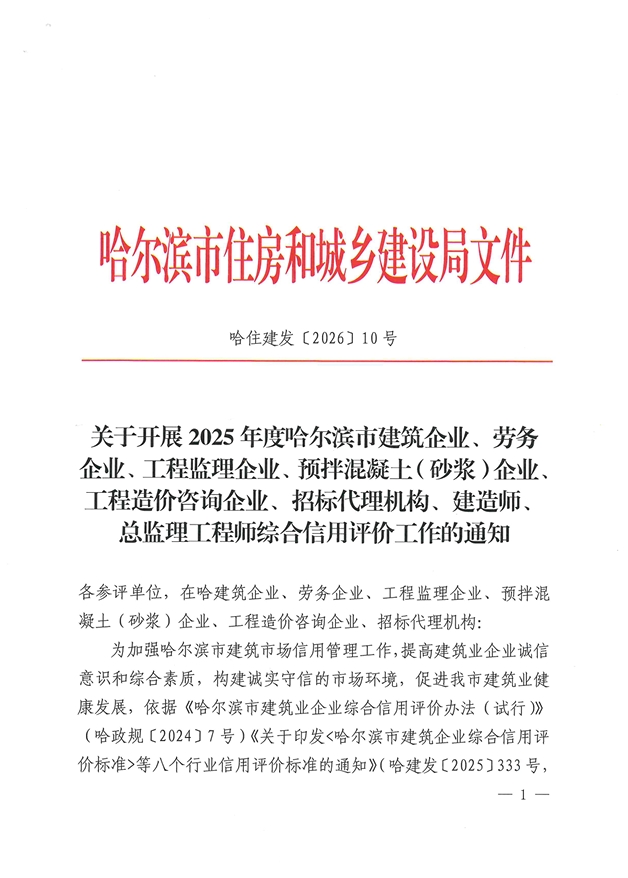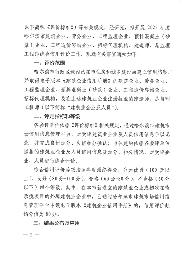 哈尔滨市住建局关于印发《关于开展2025年度哈尔滨市工程监理企业、工程造价咨询、招标代理机构、总监理工程师等综合信用评价工作》的通知